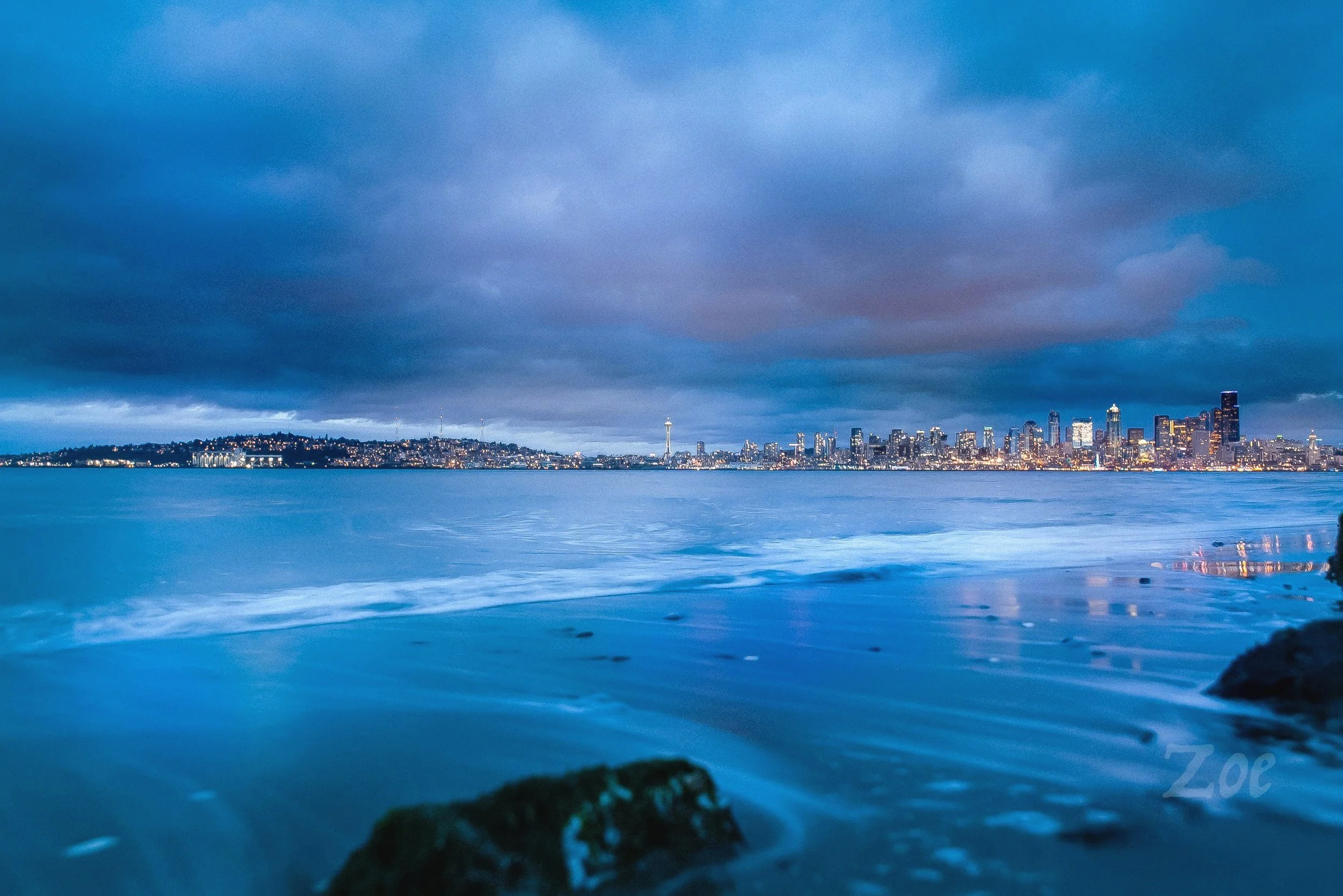 Vista de la ciudad de Seattle al atardecer con horizonte iluminado, visto desde la orilla del mar con rocas y ondas en primer plano, cielo nublado de tonos azules.