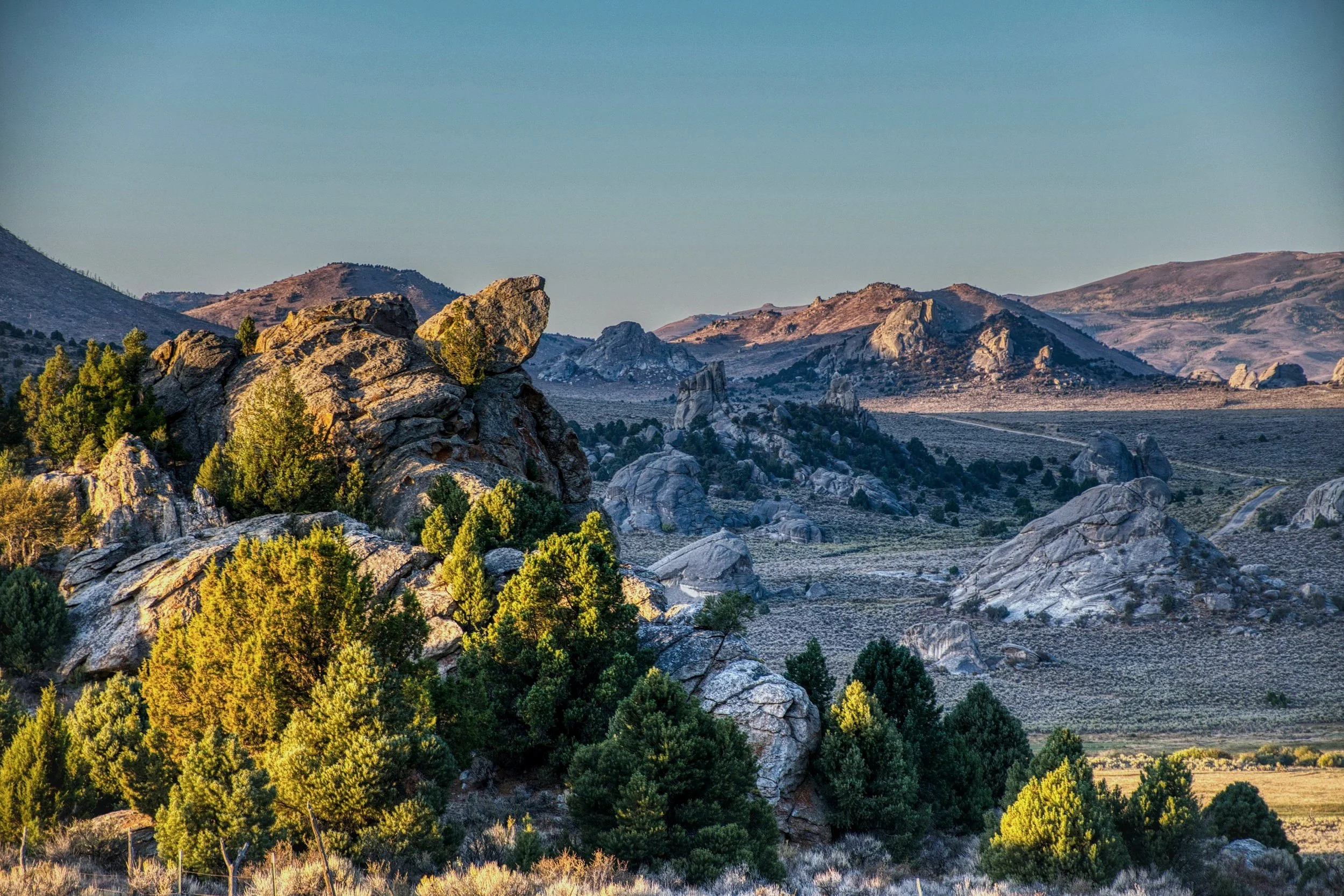Paisaje montañoso con rocas y árboles verdes, con colinas y un cielo despejado.